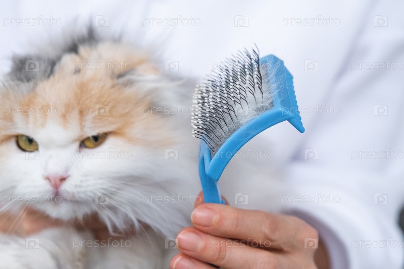 Расчесывание волос белой кошки крупным планом