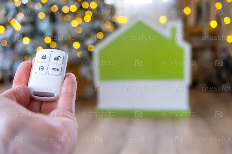 Система безопасности Keychain в руке на заднем плане феи зажигает рождественскую елку и крошечный подарок на Новый год, Рождество. Домашняя безопасность, сигнализация, сигнал SOS, защита от воров