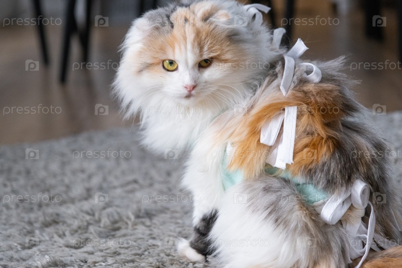 Триколор Кошка в повязке дома восстанавливается после операции по стерилизации