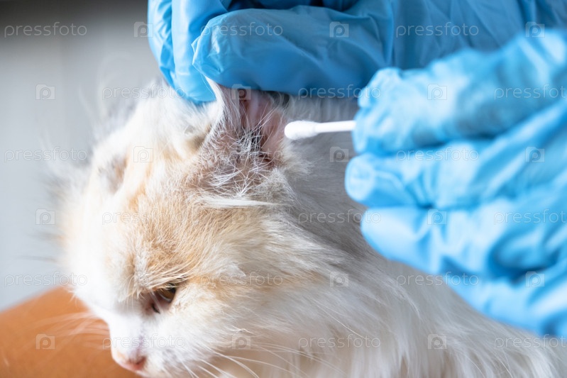 Руки ветеринара в резиновых перчатках очищают уши ватным тампоном, складные уши белой кошки