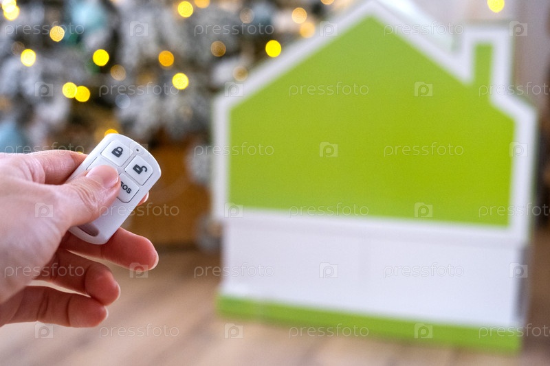 Система безопасности Keychain в руке на заднем плане феи зажигает рождественскую елку и крошечный подарок на Новый год, Рождество. Домашняя безопасность, сигнализация, сигнал SOS, защита от воров