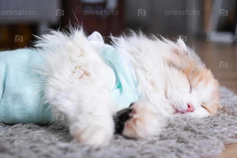 Белый кот в повязке дома восстанавливается после анестезии после операции по стерилизации, спит