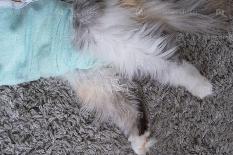 Белый кот в повязке дома восстанавливается после анестезии после операции по стерилизации, спит
