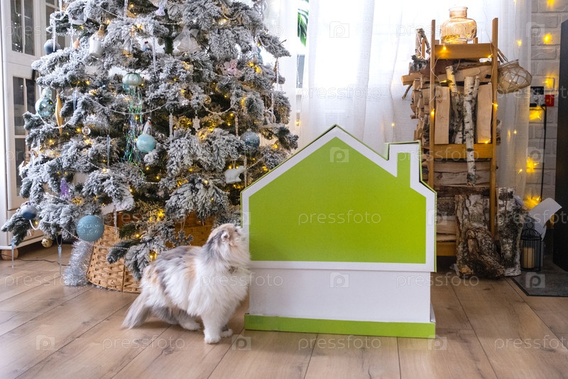 Рождественская елка украшает крошечный домик небольшого размера и кошку в интерьере дома. Подарок на Новый год, Дом домашних животных. Страхование, переезд в новый дом, ипотека, аренда и покупка недвижимости