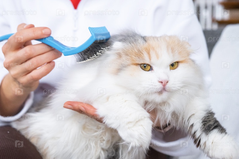 Объедините белую домашнюю кошку крупным планом, ухаживая за ее мехом гребнем. Кошка любит расчесывать
