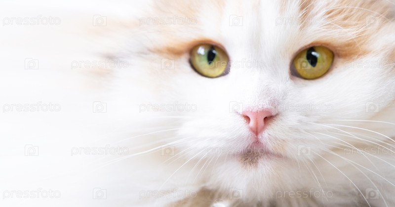 Белая кошка породы высокогорная складка смотрит в камеру, крупным планом морда с розовым носом и желтыми круглыми глазами