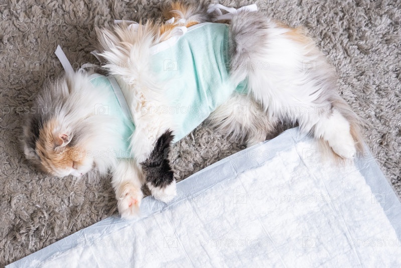 Белый кот в повязке дома восстанавливается после анестезии после операции по стерилизации, спит на водонепроницаемом подгузнике
