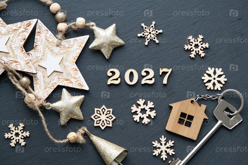Ключ от дома с кейчейном коттеджем на праздничном черном фоне со звездами, огнями гирлянд. Новый год 2027 деревянные письма, поздравительная открытка. Покупка, строительство, переселение, ипотека, страхование