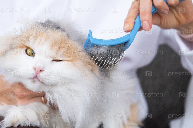 Объедините белую домашнюю кошку крупным планом, ухаживая за ее мехом гребнем. Кошка любит расчесывать