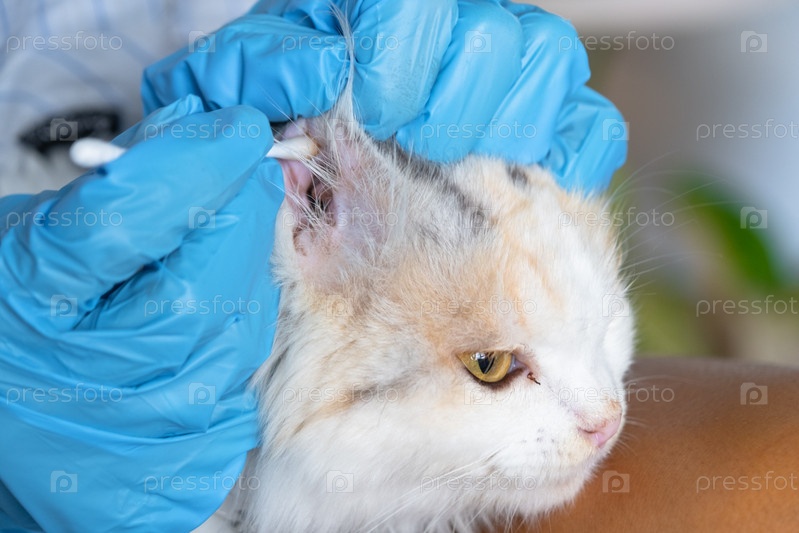 Руки ветеринара в резиновых перчатках очищают уши ватным тампоном, складные уши белой кошки