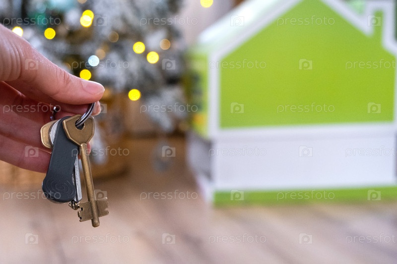 Ключи в руке на фоне сказочных огней рождественской елки и крошечного домашнего подарка на Новый год, Рождество. Строительство, дизайн, проект, переезд, страхование, ипотека, аренда и покупка недвижимости