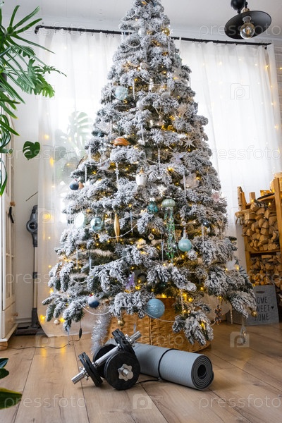 Спортивные гантели, фитнес-мат и фитнес-группы лежат под рождественской елкой дома в подарок на Рождество и Новый год