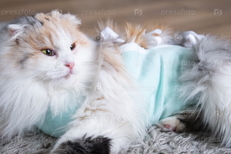 Триколор Кошка в повязке дома восстанавливается после операции по стерилизации