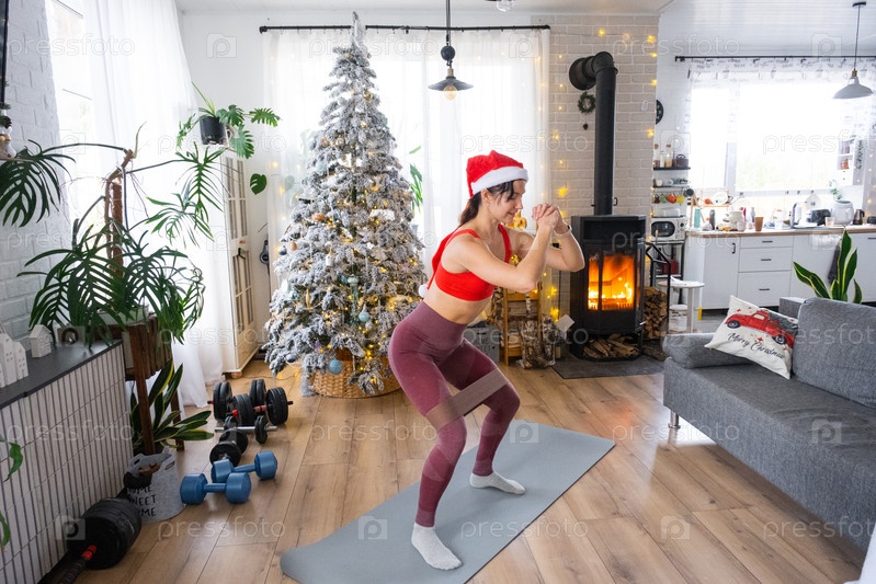 Женщина в спортивной форме и шляпе Санта занимается фитнесом и силовыми тренировками с фитнес-эластичными лентами дома в рождественском интерьере с елкой. Восстановление спортивной формы после Нового года