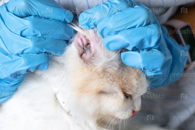 Руки ветеринара в резиновых перчатках очищают уши ватным тампоном, складные уши белой кошки