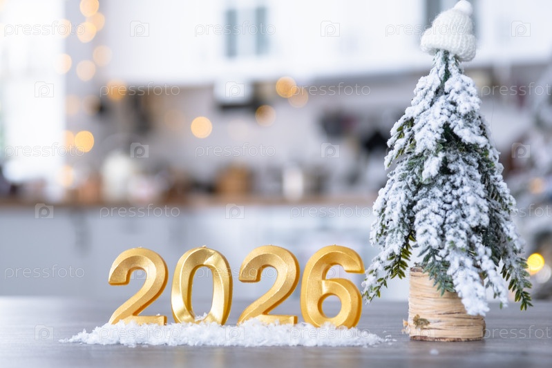 Золотые фигуры насчитывают Новый год на фоне крошечного дома с теплым светом и гирляндами. Приветственная открытка, С Новым годом, уютный дом