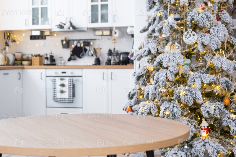 Круглый пустой стол, чтобы продемонстрировать продукт с пространством для текста на белой кухне, современный интерьер с елкой и сказочными огнями. Новый год, рождественское настроение, уютный дом