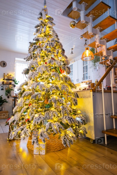 Рождественский декор в белой кухне, современный деревенский интерьер со снежной елкой и сказочными огнями. Новый год, рождественское настроение, уютный дом, Металлическая модульная лестница