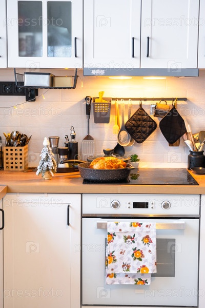 Рождественский декор в белой кухне, современный деревенский интерьер со снежной елкой и золотыми сказочными огнями. Новый год, рождественское настроение, уютный дом