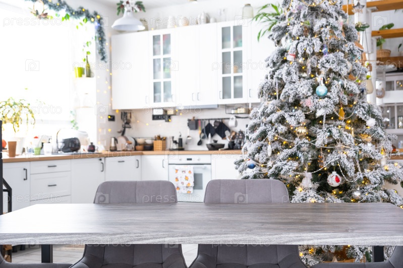 Серый деревянный пустой стол, чтобы продемонстрировать продукт с пространством для текста с обитыми стульями на белой кухне, современным интерьером с рождественской елкой и сказочными огнями. Новый год, рождественское настроение, уютный дом