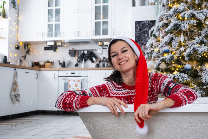Счастливая женщина в шляпе Санта лежит отдыхая в Новой ванне под елкой в качестве новогоднего подарка в интерьере украшенной кухни. Реконструкция и дизайн интерьера, строительство и улучшение дома