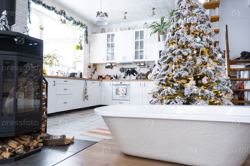 Новая ванна под праздничной елкой в качестве новогоднего подарка в интерьере белой современной декорированной кухни. Реконструкция и дизайн интерьера, строительство и улучшение дома