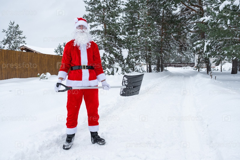 Санта-Клаус очищает снег лопатой зимой на открытом воздухе после снегопада. Уборка улиц в поселке, расчистка проезда для автомобилей, сложные погодные условия на Рождество и Новый год