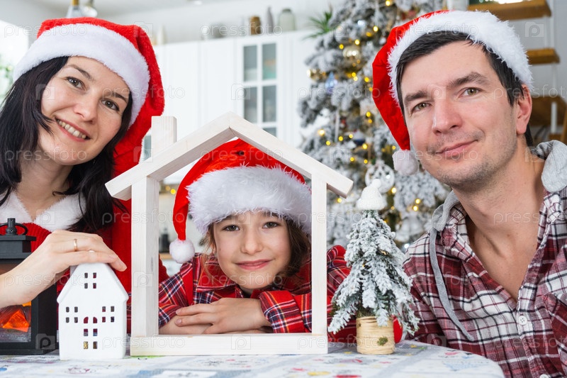 Счастливая семья в шляпах санта с крошечным домом в уютном доме с рождественским декором праздничной белой кухни. Подарок на Новый год. Страхование, переезд в новый дом, ипотека, аренда и покупка недвижимости