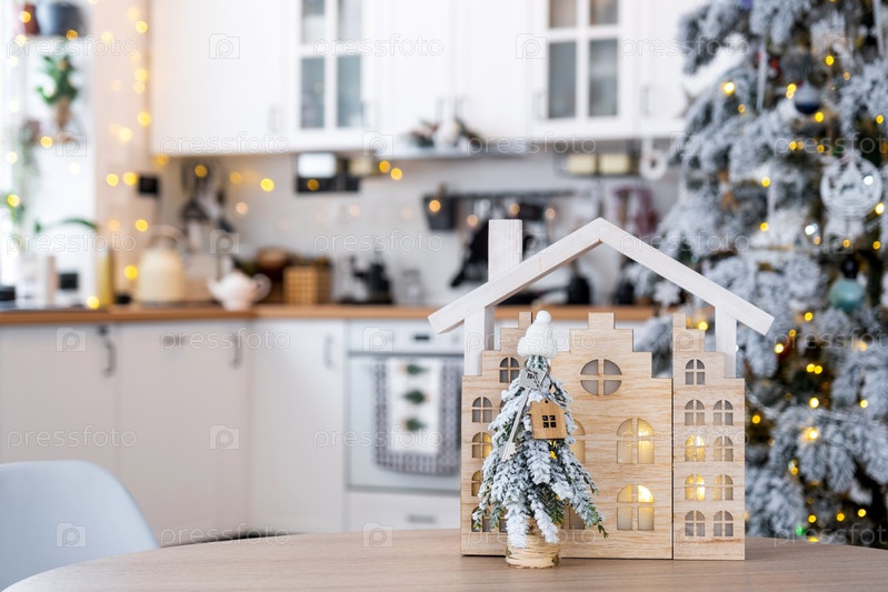 Ключ на елке и крошечный домик на уютном доме с рождественским декором на столе праздничной белой кухни. Подарок на Новый год. Страхование, переезд в новый дом, ипотека, аренда и покупка недвижимости