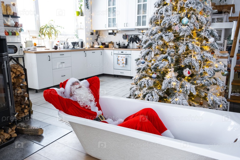 Санта лежит отдыхая в Новой ванне под праздничной елкой в качестве новогоднего подарка в интерьере белой современной декорированной кухни. Реконструкция и дизайн интерьера, строительство и улучшение дома