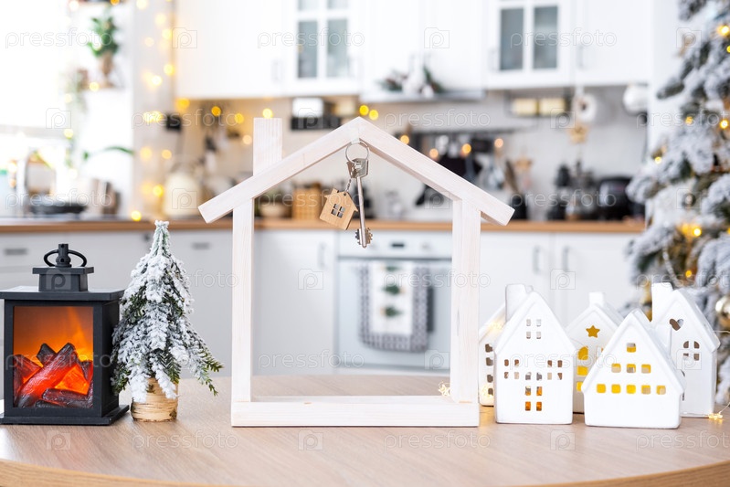 Ключ на елке и крошечный домик на уютном доме с рождественским декором на столе праздничной белой кухни. Подарок на Новый год. Страхование, переезд в новый дом, ипотека, аренда и покупка недвижимости