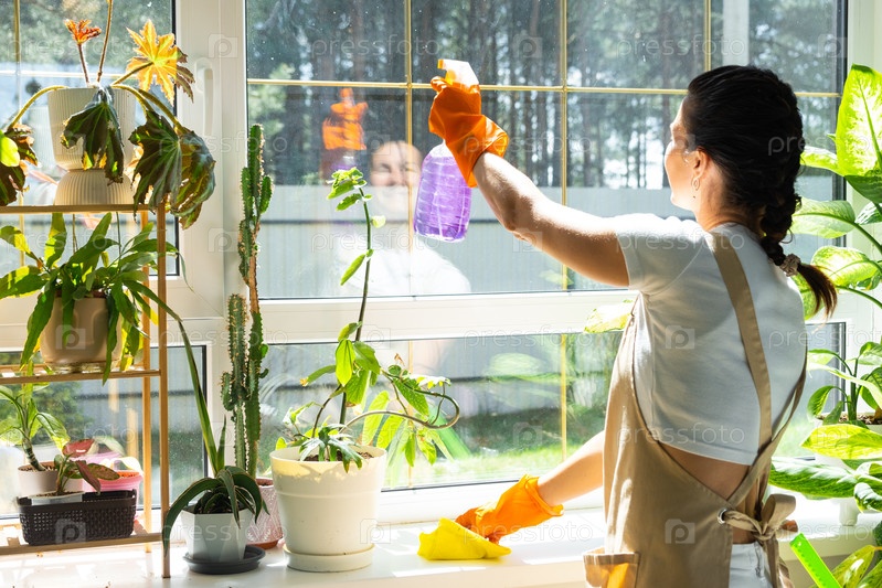 Женщина в резиновых перчатках и фартуке вручную моет окно дома тряпкой и шваброй внутри интерьера с домашними растениями на подоконнике. Восстановление порядка и чистоты весной, уборка сервиза