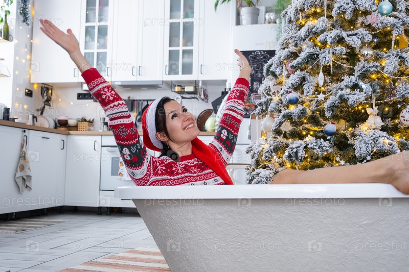 Счастливая женщина в шляпе Санта лежит отдыхая в Новой ванне под елкой в качестве новогоднего подарка в интерьере украшенной кухни. Реконструкция и дизайн интерьера, строительство и улучшение дома
