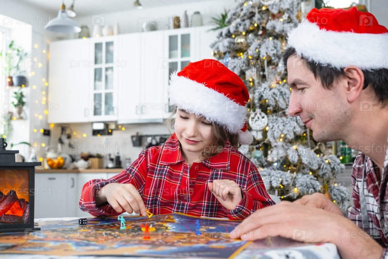 Счастливая семья папы и дочери в праздничных шляпах Санта играет в настольную игру за столом на белой кухне с елкой и декором. Новый год, семейные ценности