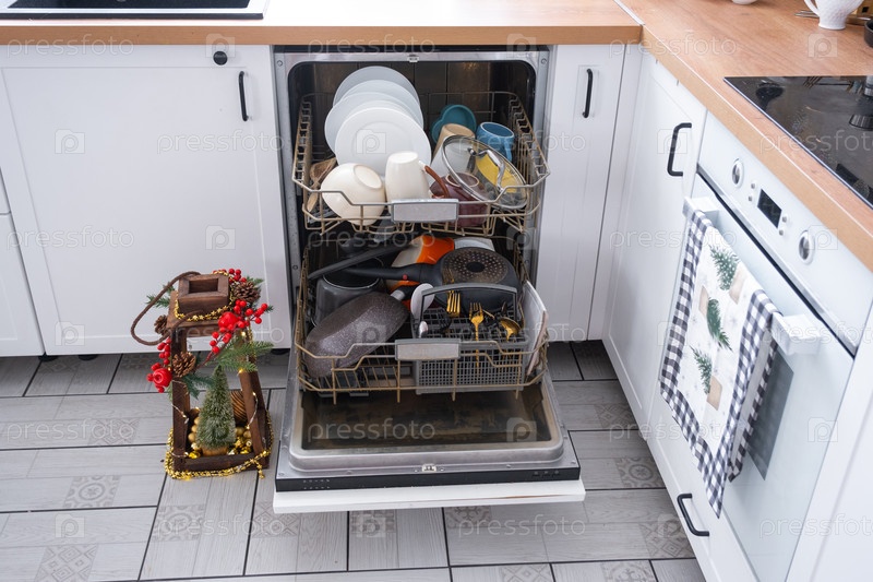 Много грязной посуды в посудомоечной машине на праздничной кухне. Помощь хозяйке, экономике и экологии. Уборка на кухне к праздникам Рождества и Нового года, после застолья и гостей