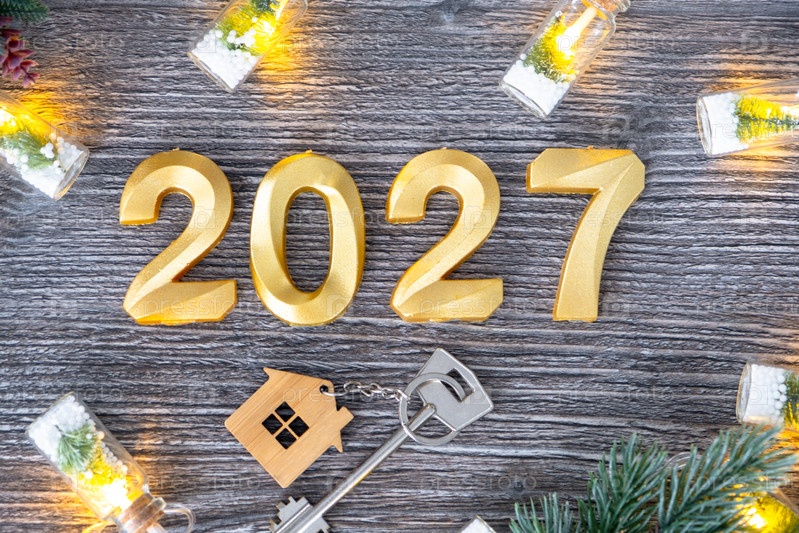 Золотые цифры 2027 года на фоне крошечного дома с теплым светом и гирляндами. Приветственная открытка, С Новым годом, уютный дом
