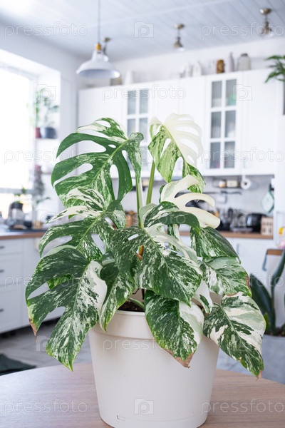 Монстрия Альба является редким разноцветным крупным планом в интерьере на стенде. Выращивание комнатных растений и уход за комнатным растением, зеленый дом