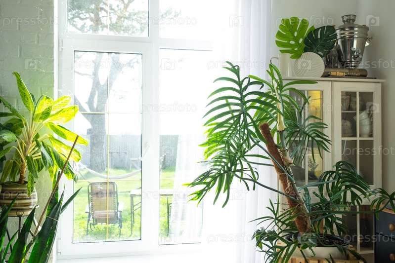 Большие комнатные растения рядом с большим окном в интерьере гостиной дома