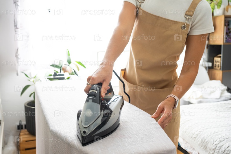 Домохозяйка женщины в фартуке утюги льняные шторы в комнате на гладильной доске