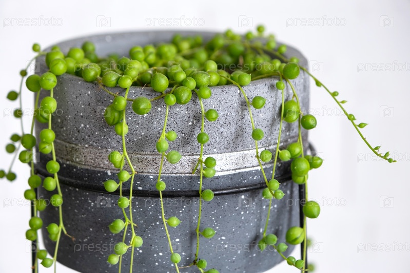 Длинные ресницы суккулента Senecio rowleyanus в бетонном горшке висят с круглыми черепаховыми листьями. Senecio rowley крупный план в интерьере на белом фоне, декоративное растение