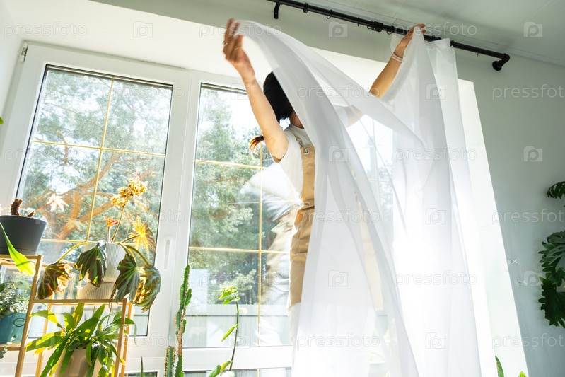 Женщина в фартуке вешает прозрачные тюльские шторы на большие окна в доме внутри интерьера с горшечными растениями. Весенняя уборка, уборка
