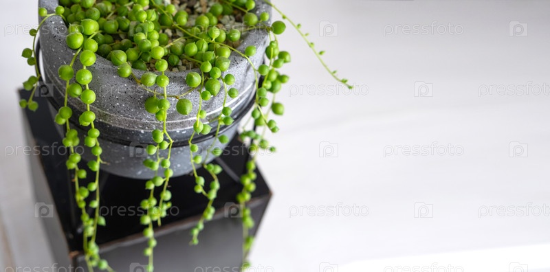 Длинные ресницы суккулента Senecio rowleyanus в бетонном горшке висят с круглыми черепаховыми листьями. Senecio rowley крупный план в интерьере на белом фоне, декоративное растение