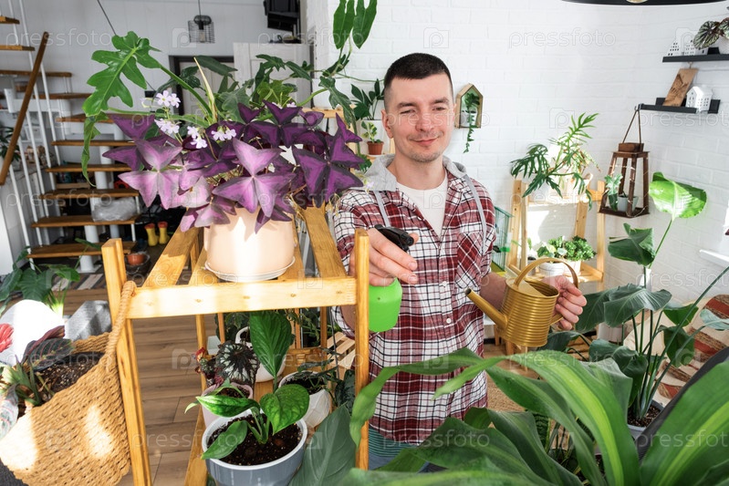 Мужчина ухаживает за домашними горшечными растениями на полках, распыляя против вредителей, своим делом