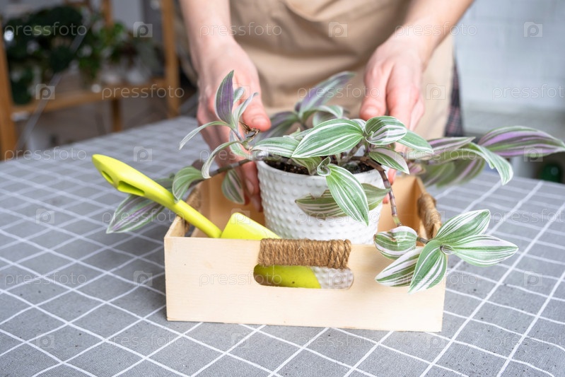 Пересадка и уход за домашним растением в новый домашний интерьер горшка. Женщина выращивает растения хобби, держит полезные растения