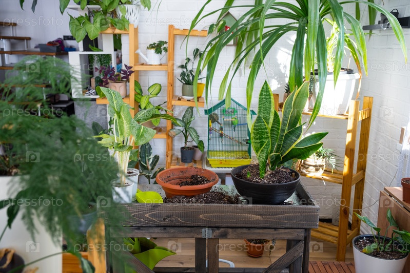 Sansevieria trifasciata на столе флористов для пересадки и ухода за домашними растениями в интерьере зеленого дома с горшечными растениями
