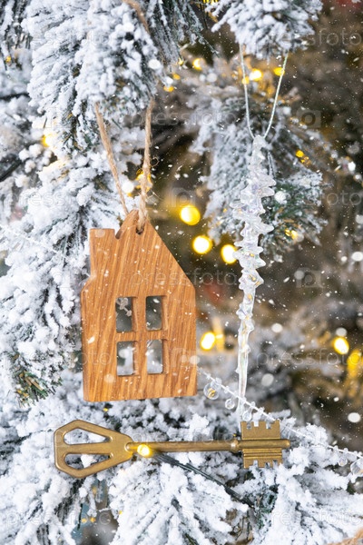 Ключ и крошечный дом в руке на заднем плане сказочной елки. Подарок на Новый год, Рождество. Строительство, дизайн, проект, переезд, страхование, ипотека, аренда и покупка недвижимости