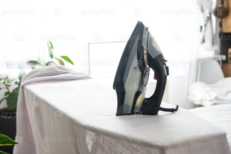 Железо находится на гладильной доске с простой тканью в комнате крупным планом