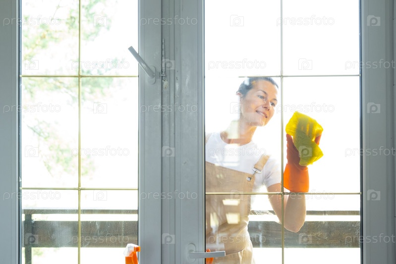 Женщина в резиновых перчатках и фартуке вручную моет оконный балкон дома тряпкой и шваброй снаружи за стеклом. Восстановление порядка и чистоты весной, уборка сервиза