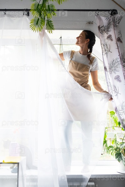 Женщина в фартуке вешает прозрачные тюльские шторы на большие чердачные окна в доме внутри интерьера с горшечными растениями. Весенняя уборка, уборка