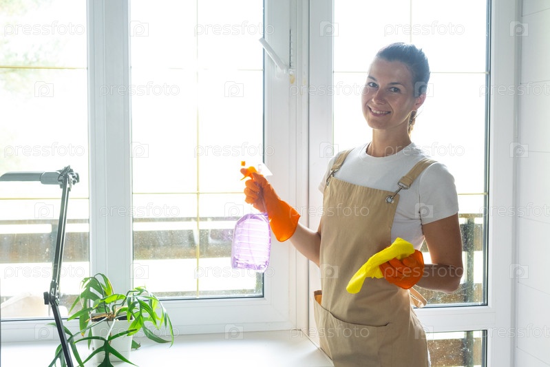 Женщина Портрет в резиновых перчатках и фартук вручную моет оконный балкон дома тряпкой и шваброй внутри интерьера. Восстановление порядка и чистоты весной, уборка сервиза